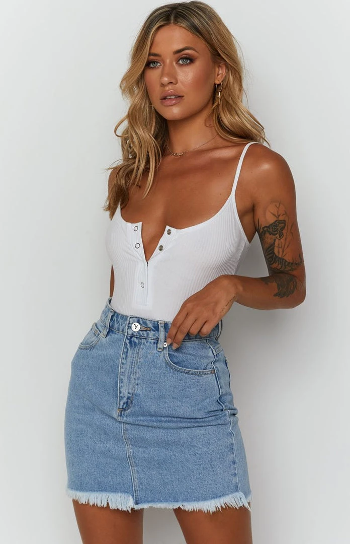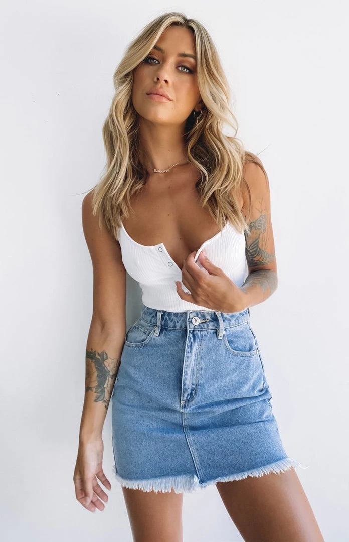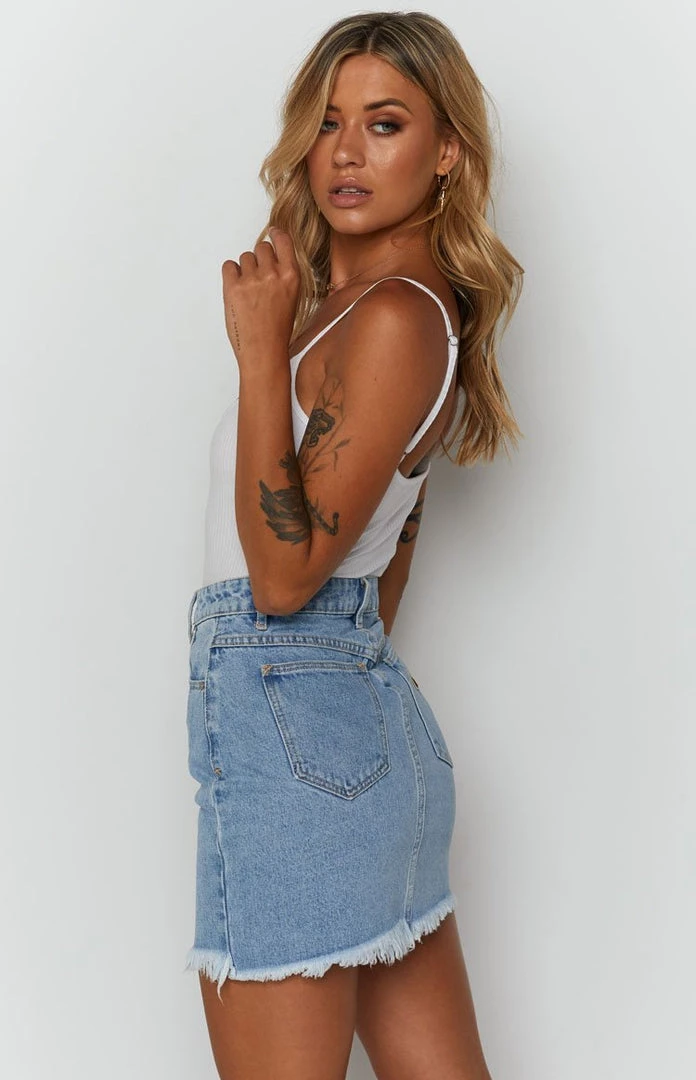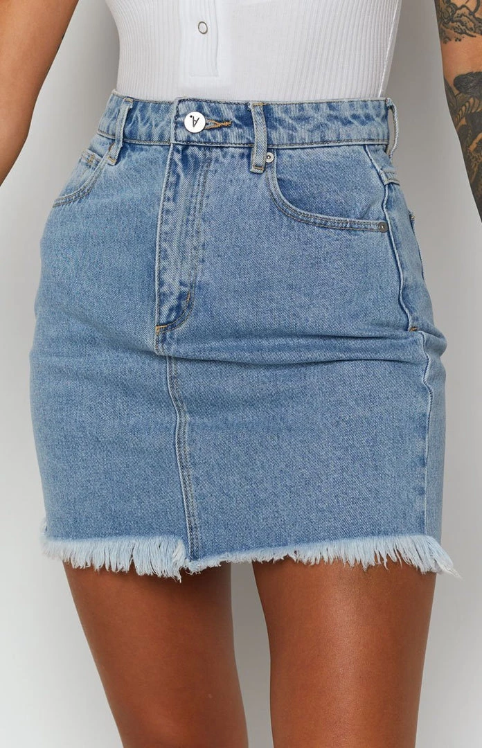 From the classroom to the local University Bar, the A Skirt Esmerellda but Abrand will have you feeling cool and casual. Style this denim mini skirt with a cool vintage tee or crop top and slides.