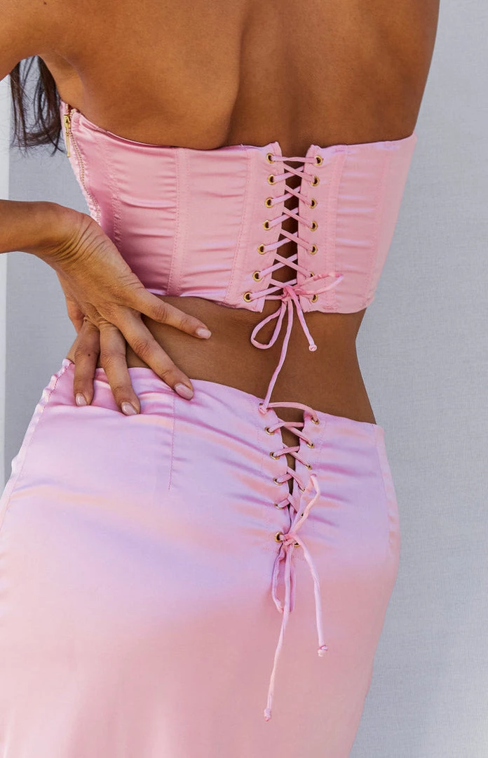 - Obsessed with this stunning pink corset crop top! Style with the matching Mckenzie Satin Maxi Skirt for a luxe going out look. You’re bound to stand out in any crowd in this gorgeous set. Perfect for a cocktail night out – just add some dainty jewellery and heels! Or switch it up with jeans and boots for a more casual fit.