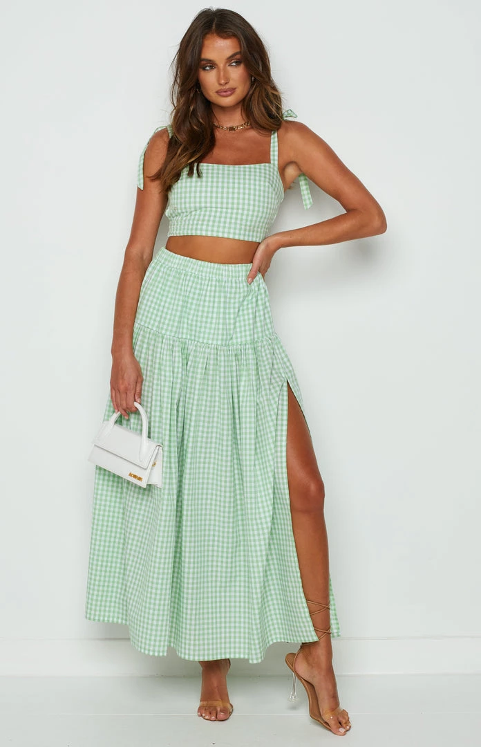 - Looking for the perfect set this summer? We’ve got you covered girl! Style this flowy maxi skirt with the matching Cosmos Top Green Gingham for a cute two piece set you can wear to your next winery or look super cute for an upcoming day-time wedding!