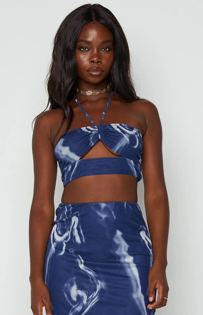- This crop is perfect for so many occasions, whether its a causal day by the beach or for drinks with the girls! Wear with the matching Fable Navy low Rise Mesh Midi Skirt for a cute two piece moment or pair with shorts for a more casual vibe!