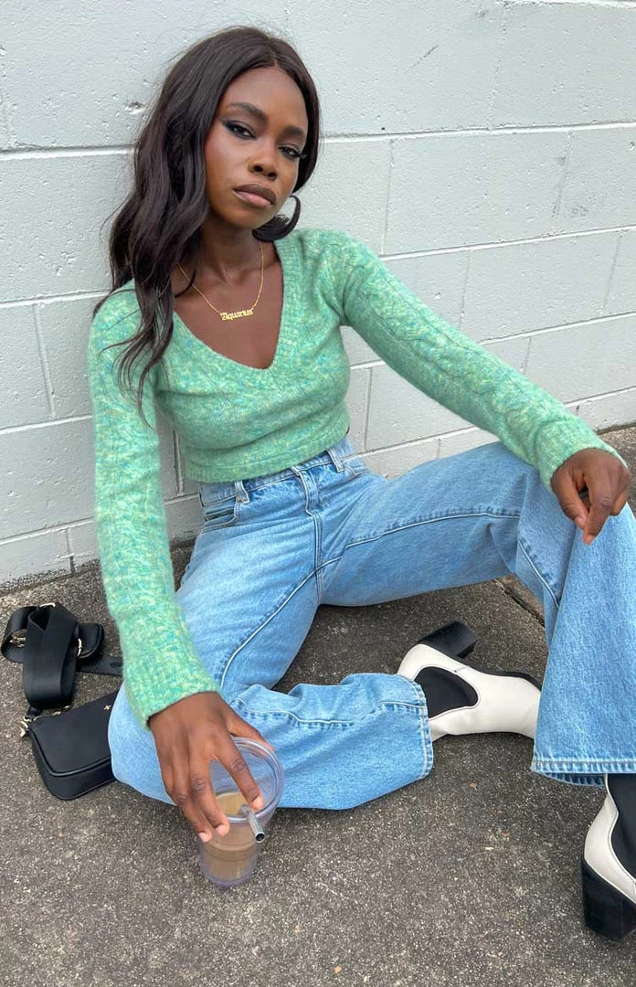 - Green cropped knit sweater