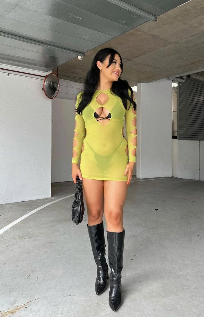 - We’re green with envy over this fun long sleeve mini! With keyhole cut outs throughout and a totally sheer look, this dress is the perfect sexy meets cool festival vibe!