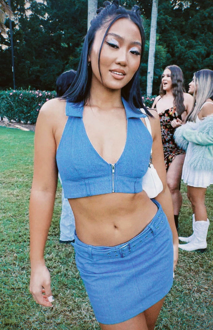 - Throwback to early 2000s in this denim crop top. Style with the Jordan Mini Denim Skirt to complete the matching fit. Rock this look with knee high boots and gold jewellery.
