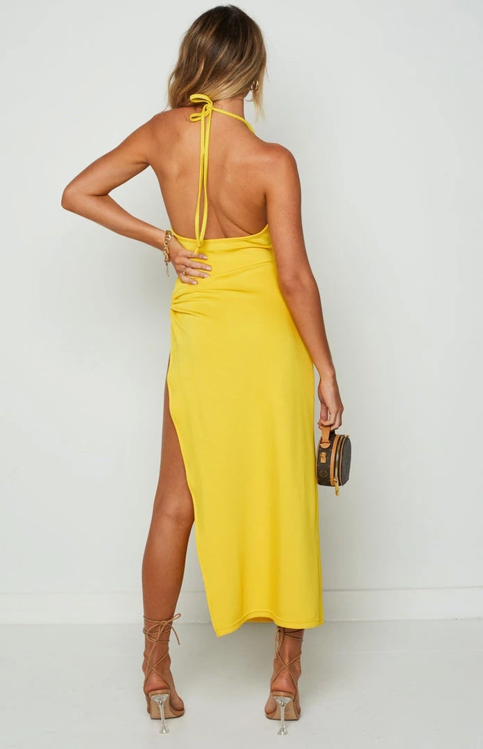 - A backless midi with a slit? Say no more! Perfect for the more formal occasion, this midi dress will have you standing out in a crowd. Pair with gold accessories and simple heels to complete the look!