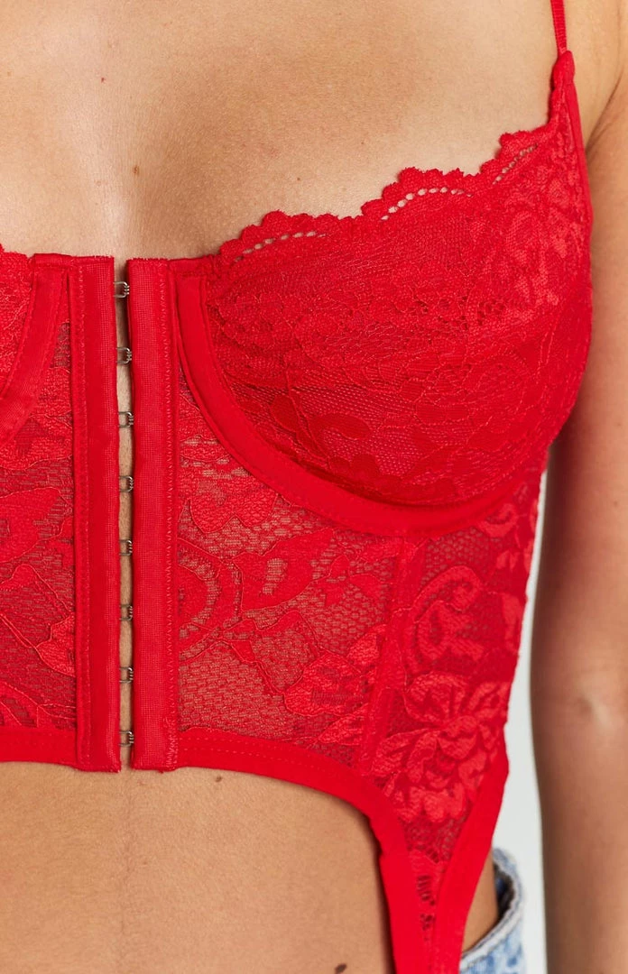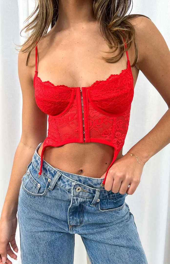 - Look super hot in this red little number! This corset is a show stopping piece that adds flare to any going out fit. Pair with pants or jeans and some heels for the ultimate look. Perfect for your next night out in the city!