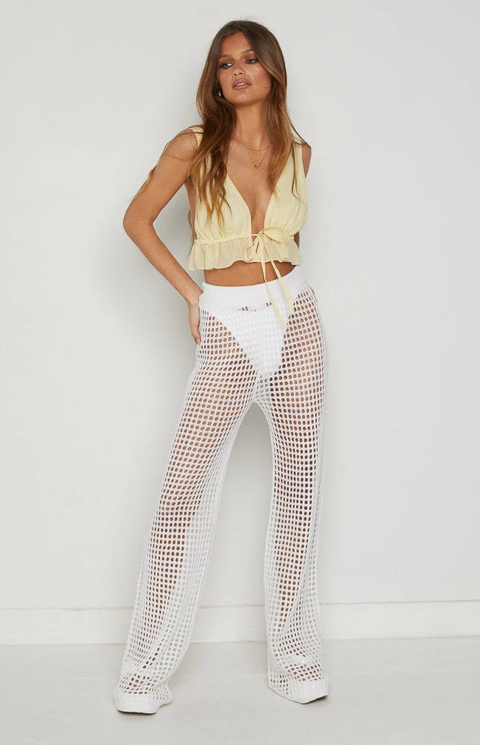 - Spice up your wardrobe with these white crochet pants. Your new go-to beach cover up. These pants look oh so gorg with a little crop and sunnies. A look you can’t miss out on!