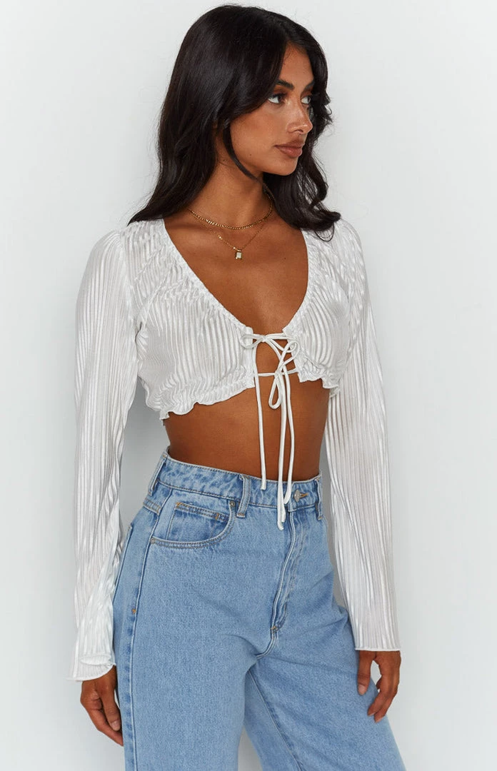 BB Exclusive Tayla White Pleated Long Sleeve Top New