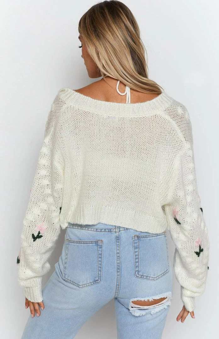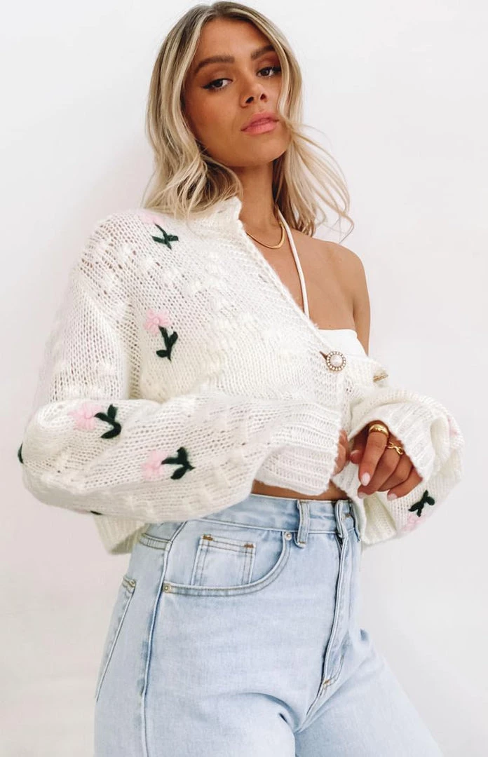 - The sweetest cardigan around town! This cropped cardi features pearl diamante buttons and pink flowers to create an adorable look