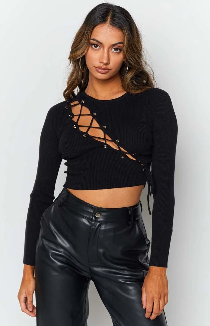 - Stand out from the crowd when wearing this lace-up knit top on a night out with a mini skirt and heels.