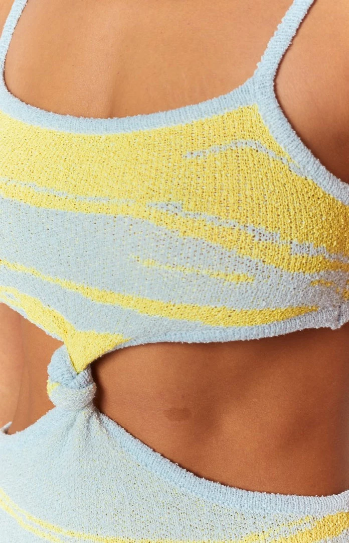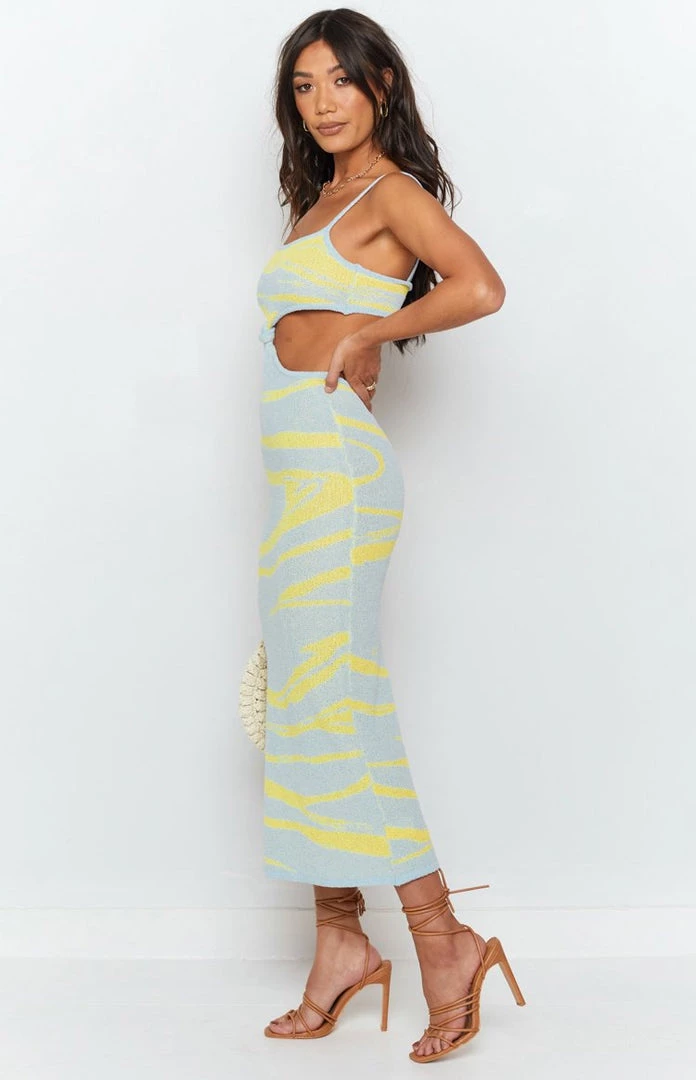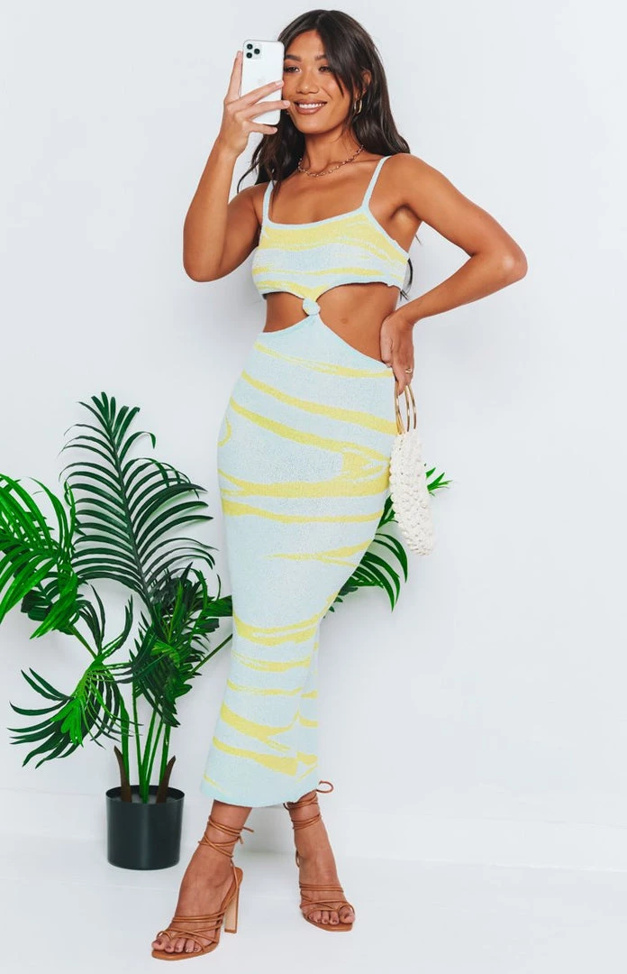- We love a classic midi dress here at BB, and we especially love the unique colour combo of this one! The knit fabric and yellow stripes make it the perfect dress for any occasion- simply pair with heels and a cute shoulder bag!
