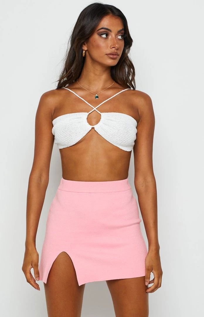 - We adore this pink knit mini skirt! Channel your inner Barbie in this skirt paired with a pink or white crop and heels – feeling fab girl!