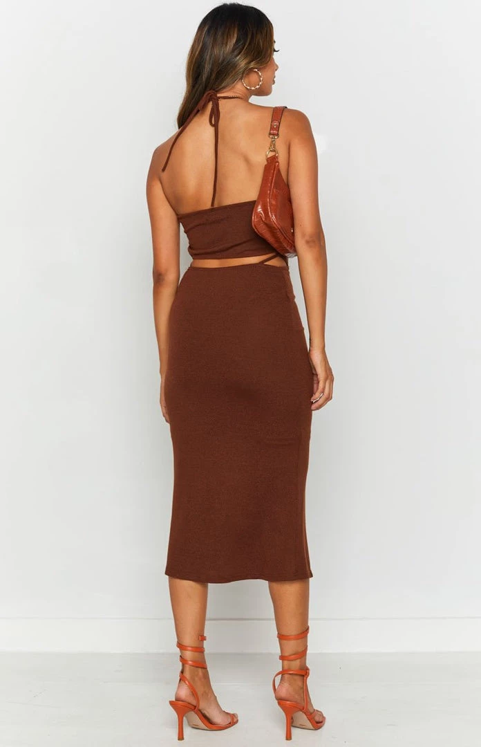 Beginning Boutique Dresses Quanah Cut Out Midi Dress Brown