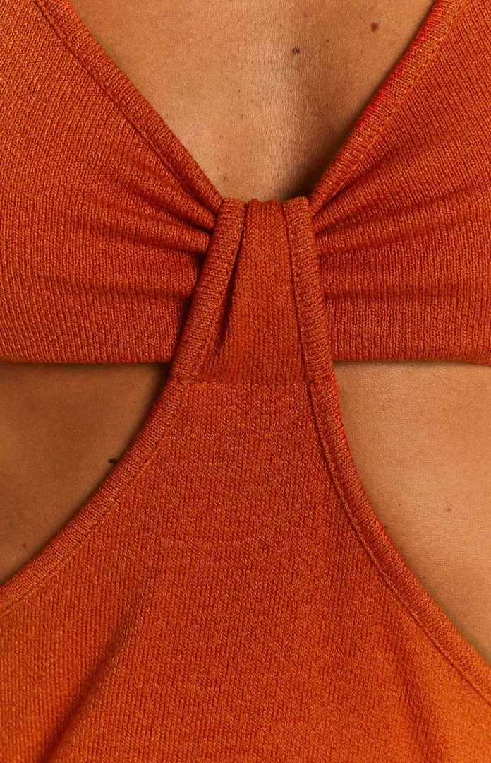 - This gorgeous rust midi features a flattering v-neckline and waist cutouts – dress it down with white sneakers or dress it up with heels and a red lip!