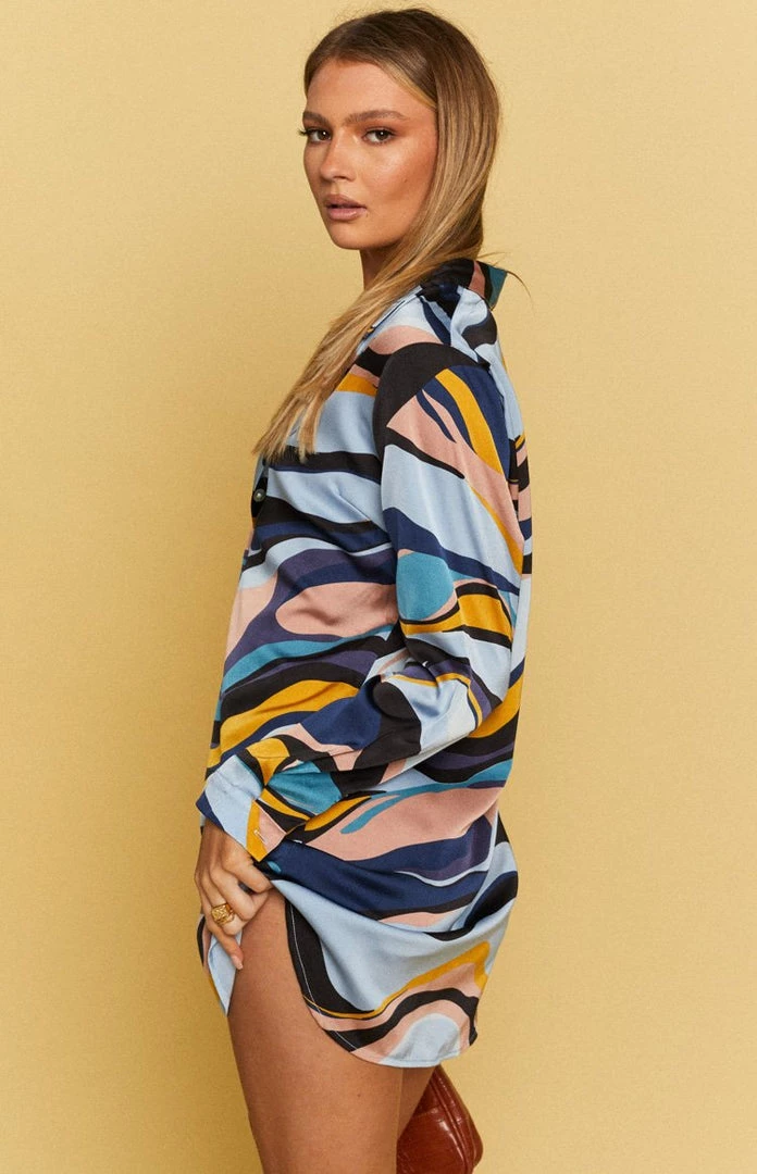 Beginning Boutique Dresses The Wavy Long Sleeve Shirt Dress Blue