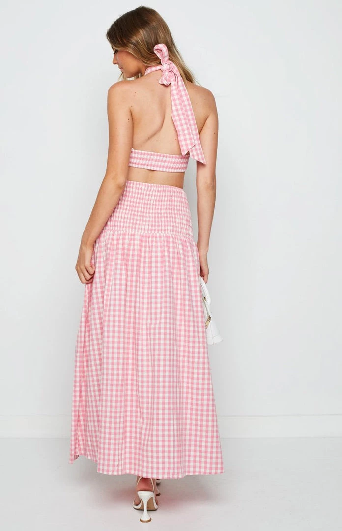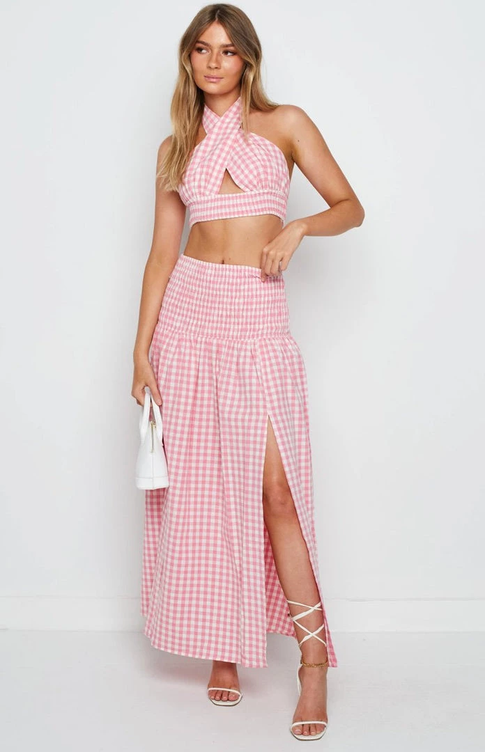 - This beautiful gingham print is the perfect pop of colour to add to your wardrobe. Pair this maxi skirt with the matching Fletcher Pink Check Halter top and you’ve got the perfect fit for a Summer Soiree. Add sandals and jewellery to complete the look!