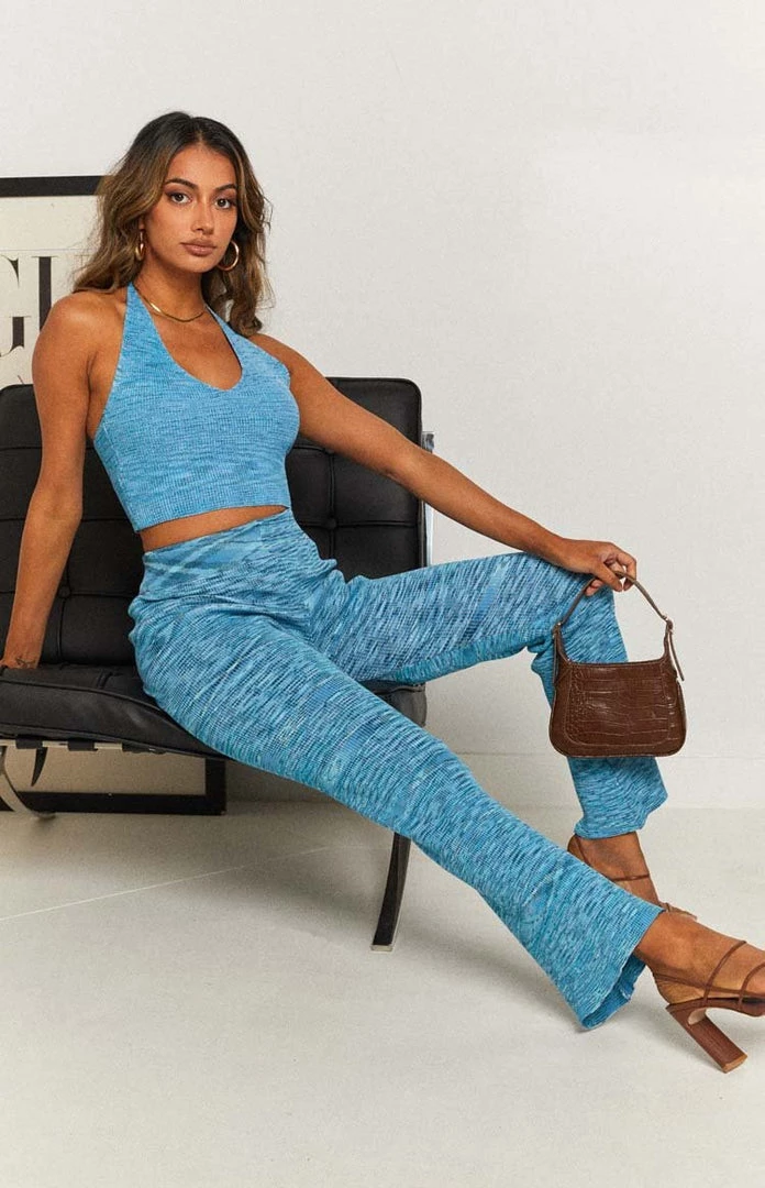 Beginning Boutique Hawaiian Knitted Halter Crop Top Blue Tops