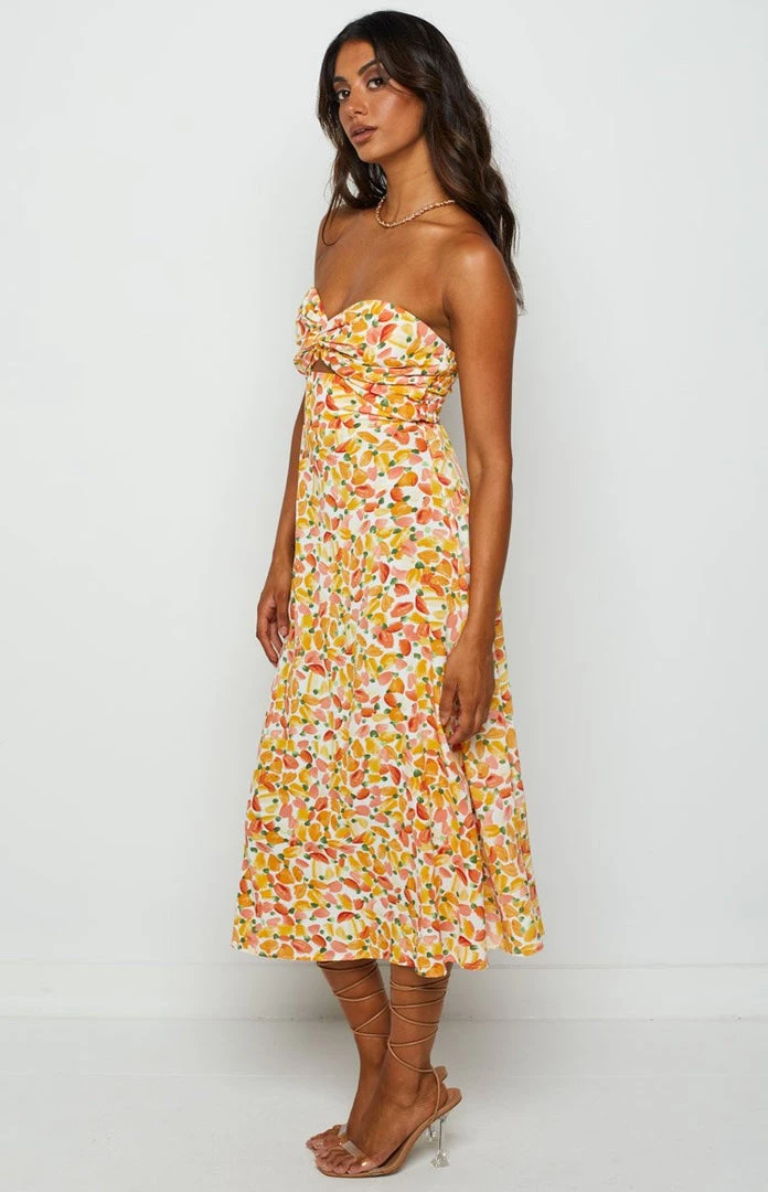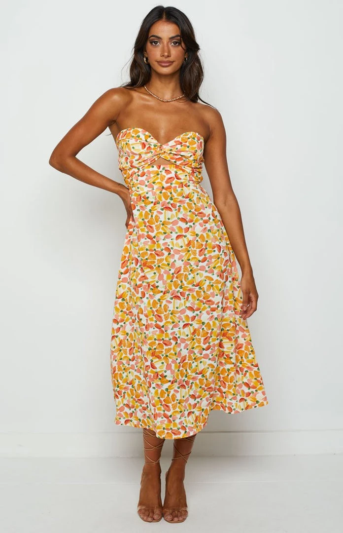 - Get picnic ready with this ultra cute strapless midi dress, just don’t forget to pack your fav cheese and crackers! The colours and fabric of this dress are just some of the reasons why it has become our new fav. Pair with sandals or wedges and a tote to finish the look!