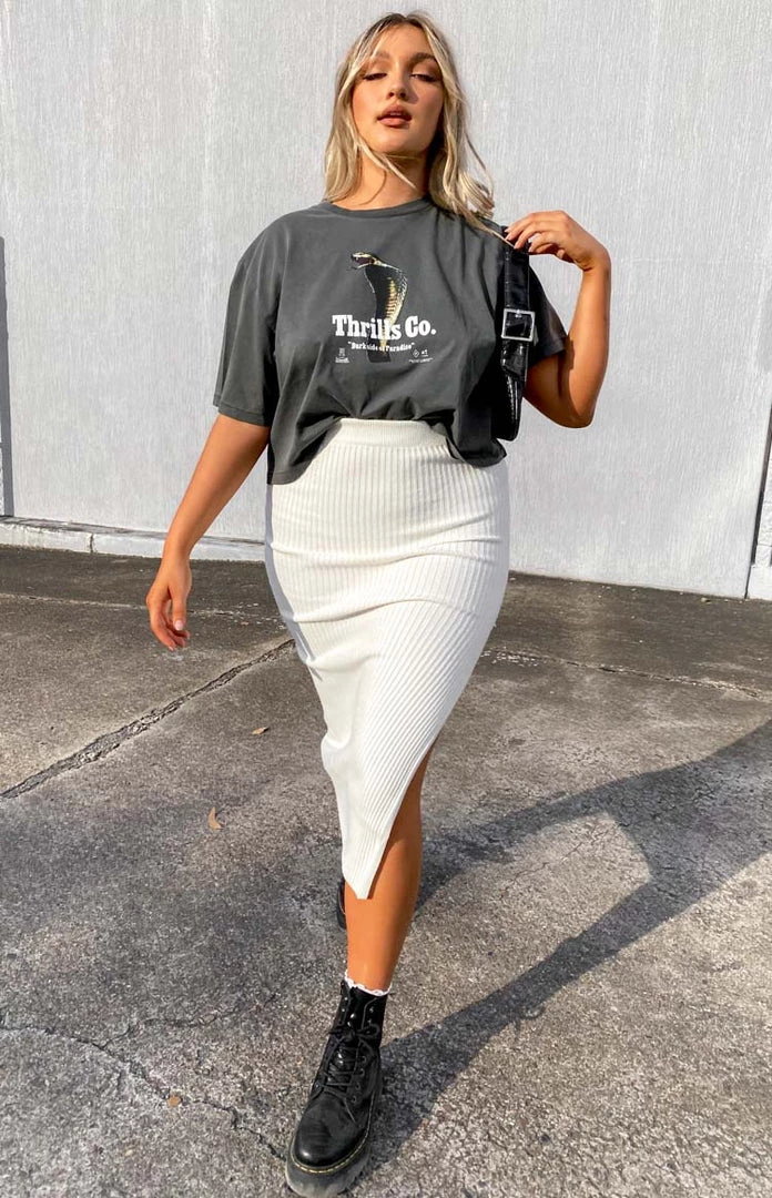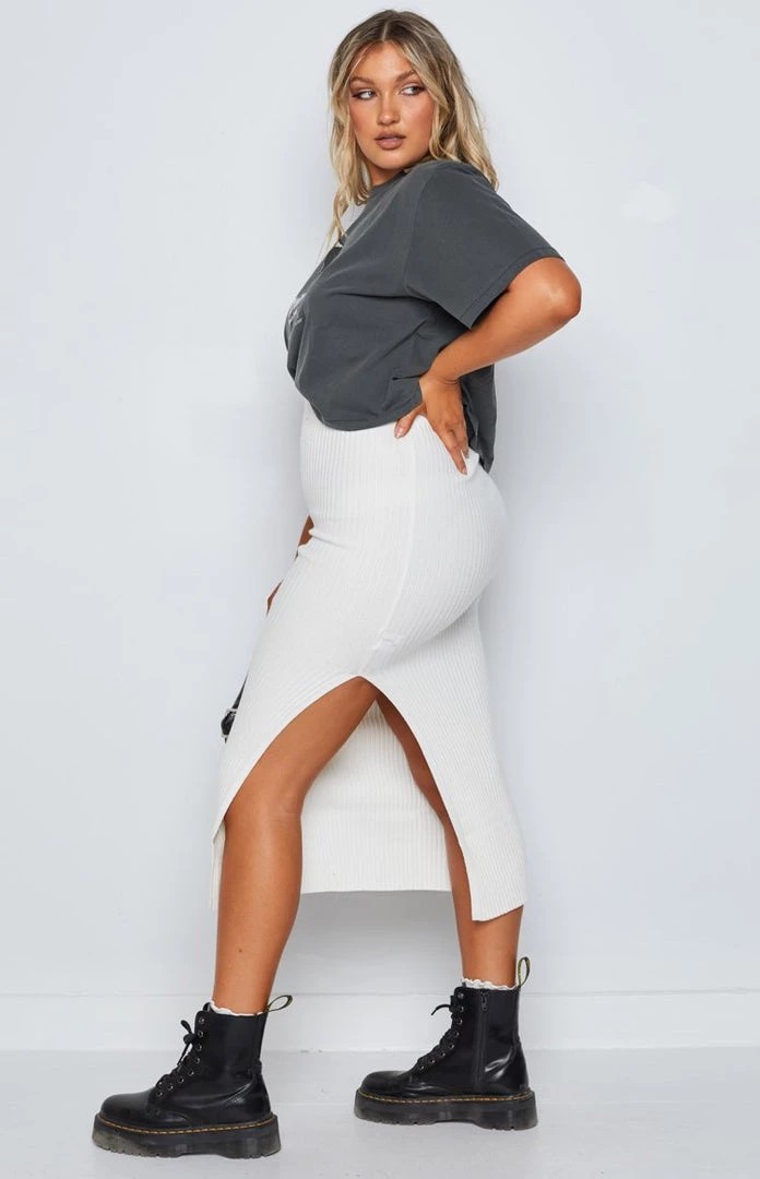 The Laurena Knit Midi Skirt White is all about the sleek, sophisticated style. She’s a showstopper, that’s for sure, hugging your figure in all the right places and featuring a sexy little leg split. Dress her up with a black crop top, heeled boots and a mini bag for a stunning evening outfit.