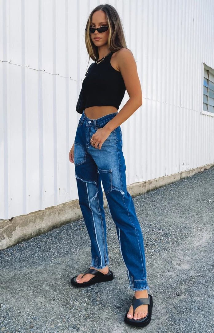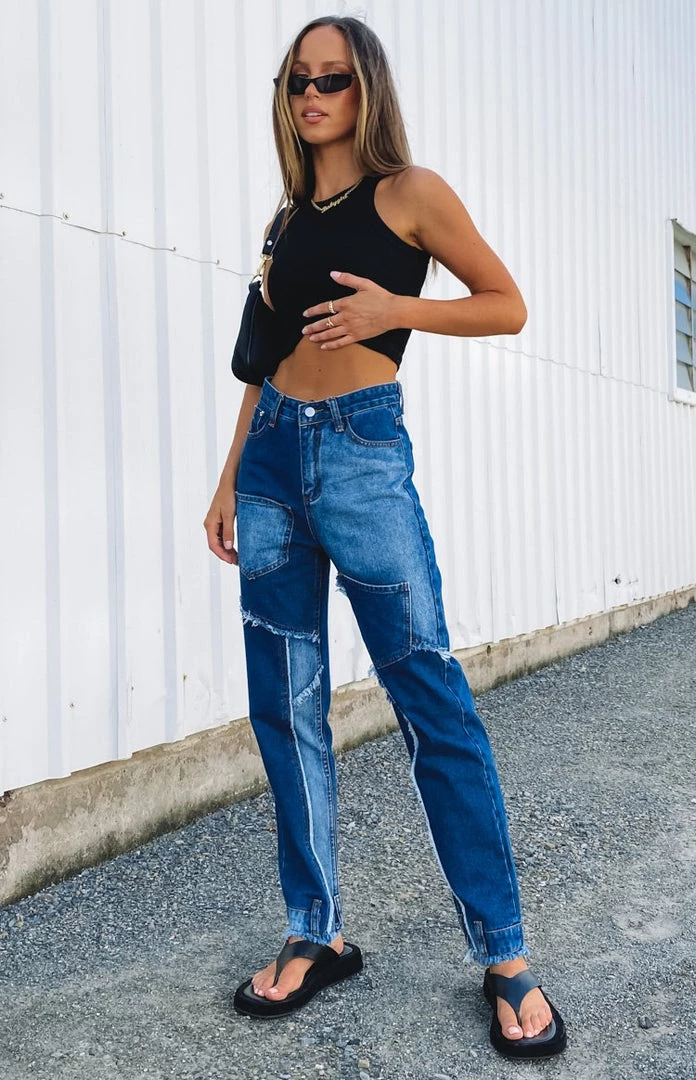 - These bold statement jeans are anything-but-basic! With patchwork fray stitching and unique front pocket detail, all you need is a basic crop top and you’ve got yourself a killer look!