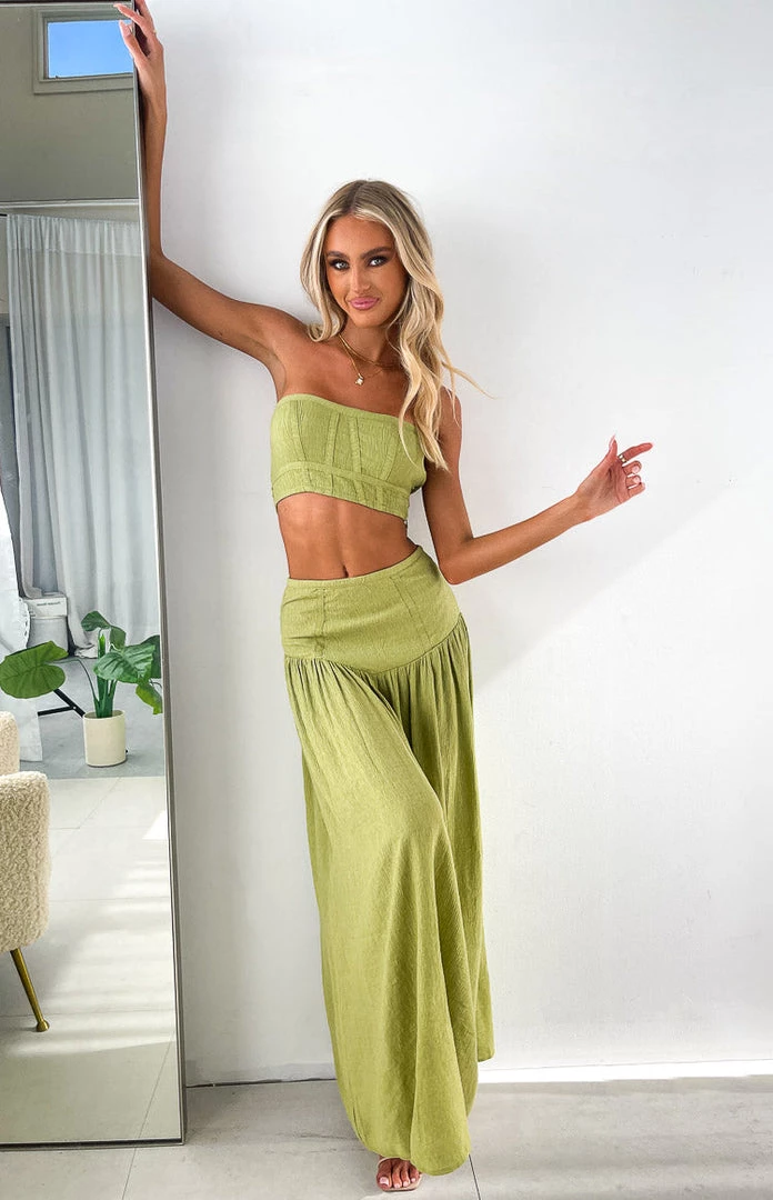 - Wine tour ready in this gorgeous green midi skirt. Styled with the matching Dalila Crop Top makes this the perfect outfit! Add the finishing touches of gold dainty jewellery and a shoulder bag for a chic look!