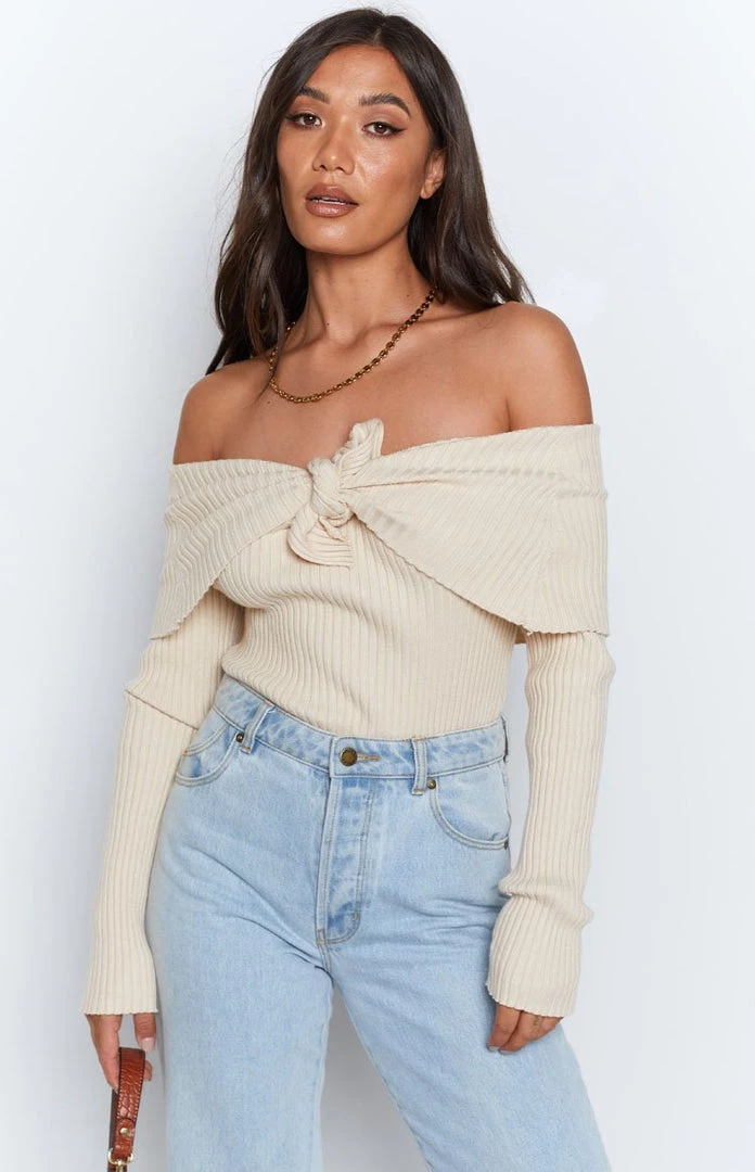 - We love this off the shoulder sweater! It features a tie-up bust, adding extra style and class! Pair with boots to finish the look!