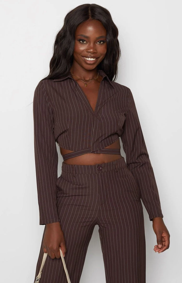 Beginning Boutique Tops Sinner Pinstripe Shirt Brown