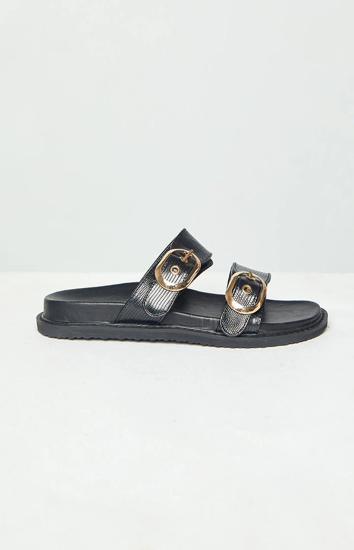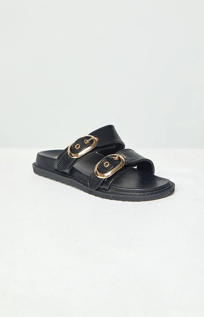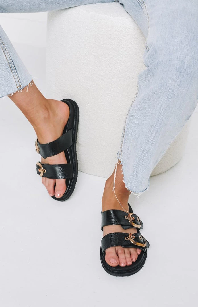 - Complete your comfy outfit with these black sandals. The gold hardware will lift your ‘fit!