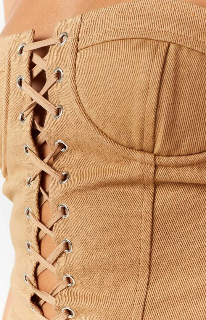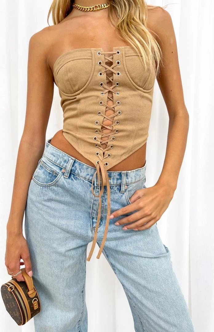 - Get ready for the ultimate model-off-duty look by styling this corset with baggy pants and simple heels. We’re obsessed with the strapless neckline and tie-up design of this hot piece!