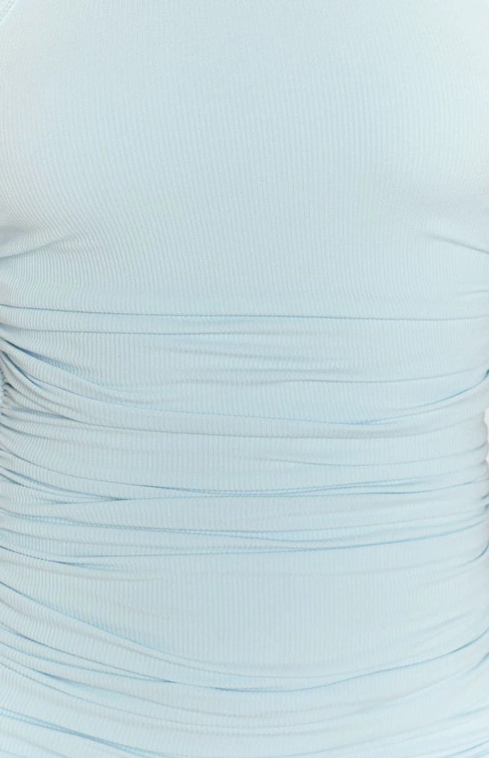 This mini dress features beautiful blue colour and hugs the body so nicely!