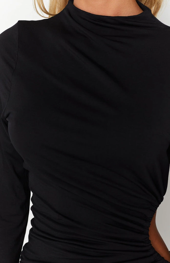 - All eyes on you in this stunning black midi dress. The high neckline is so elegant with a high leg split to give it some spice! Add heels and jewellery to complete this show stopping outfit!